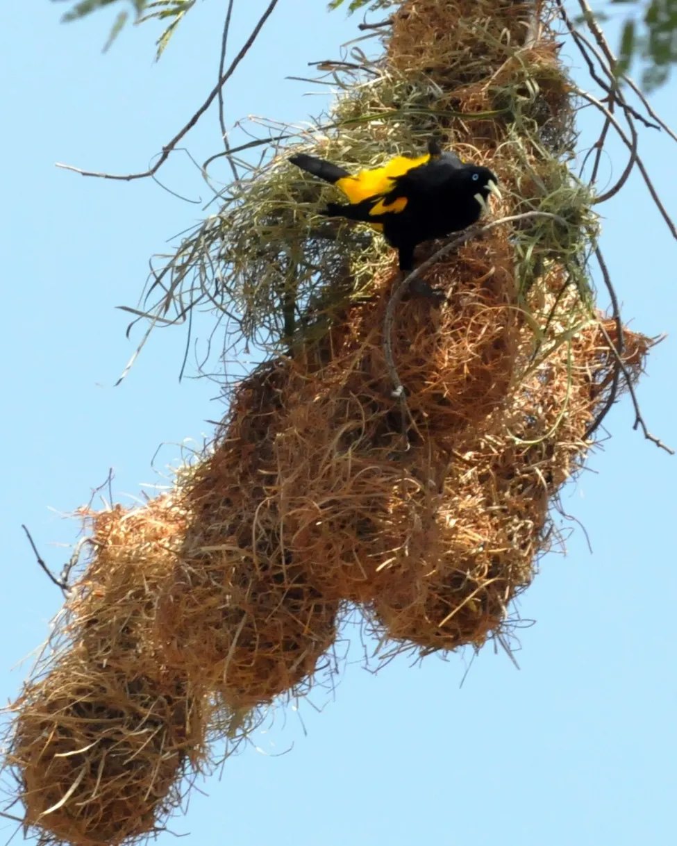 Seu ninho é feito de folhas de palmeiras, gravetos e capim com a forma de uma bolsa pendurada com 40 a 70cm de comprimento. No caso desse tem o formato do mapa do Piauí. Viva o Piauí.