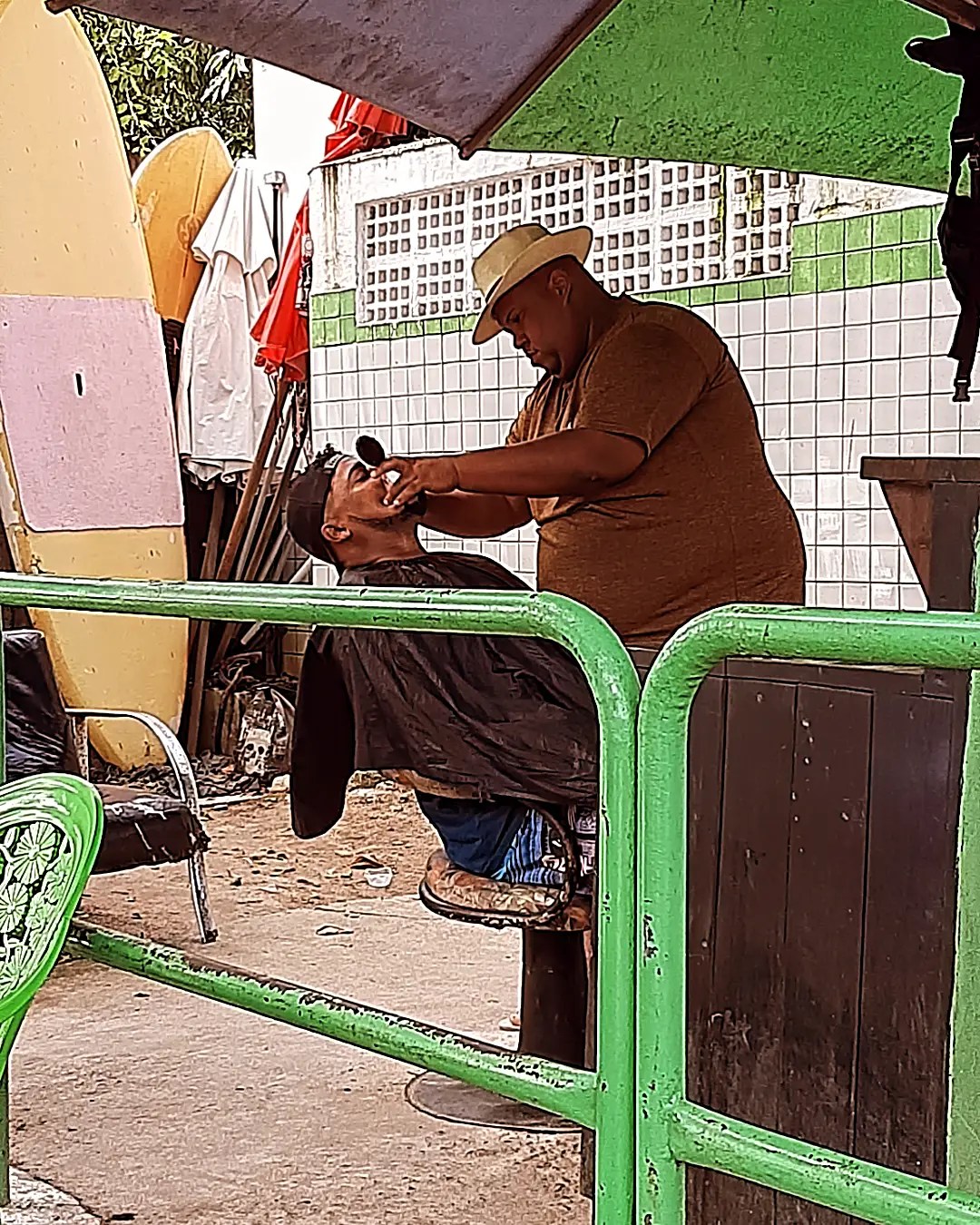 Em Porto de Galinhas no litoral pernambucano não é só o luxo e o glamour dos famosos e caríssimos resorts. Tem o popular. Um "salão" sob uma cobertura móvel às vistas de quem passa por um local de acesso à praia um profissional atende sua clientela. Formada expressivamente por homens.