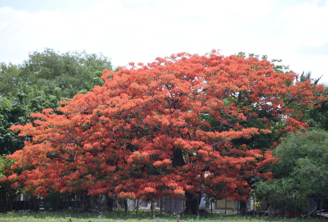 Flamboyant, nativa de Madagascar, de folhas bipenadas, flores vermelhas ou cor de laranja e vagens lenhosas, castanho-escuras, com várias sementes, cultivada como ornamental, bastante usada em arborização urbana e dotada de propriedades medicinais; flor-do-paraíso, pau-rosa, trambolhão. Viva o Piauí.