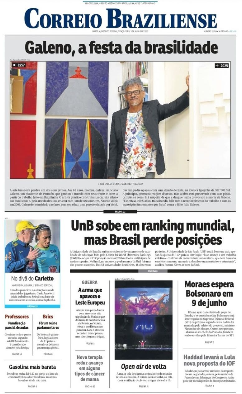 O Jornal Correio Brasiliense, editado na capital federal, Brasília, traz na edição desta terça-feira, 03 de junho, matéria de capa homenageando o artista plástico nascido em Parnaíba-Pi e morto no dia de ontem aos 68 anos de idade conhecido como Galeno. Um artista reconhecido internacionalmente. Tal prestígio veio depois, como assinala a matéria no jornal, que o cerimonial da Presidência da República passou a adquirir os seus quadros para que os presidentes Fernando Henrique Cardoso, Lula e Dilma presenteassem os representantes de outros países com suas gravuras. O presidente Barack Obama foi um dos agraciados.