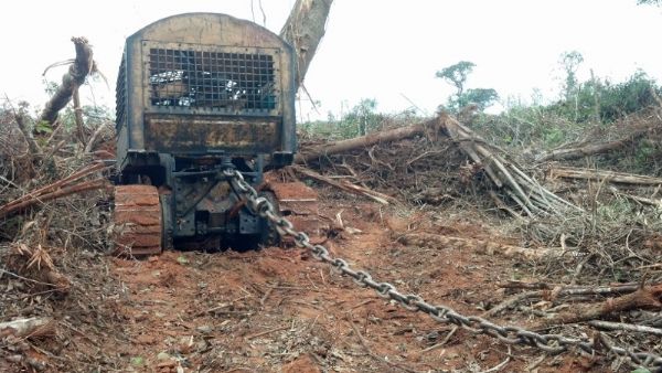 Correntão puxado por máquinas para devastar áreas cobertas de árvores
