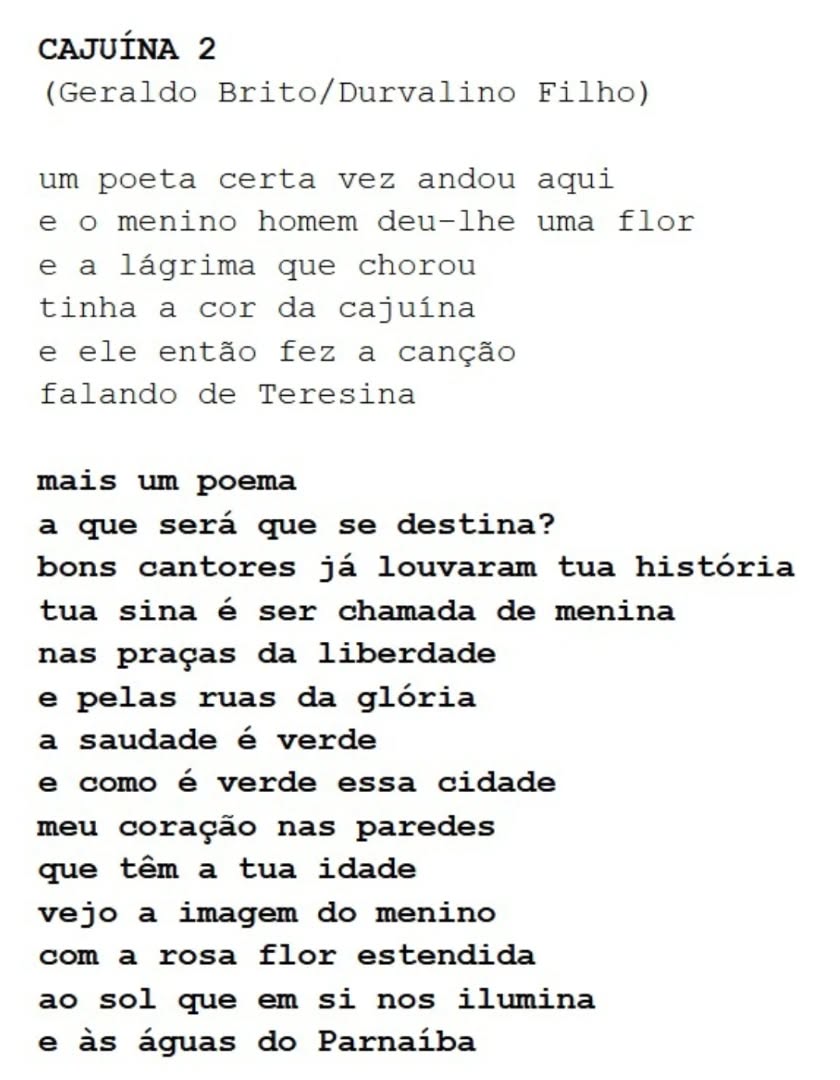 A (música) Cajuína de Caetano Veloso que homenageia Teresina inspirada na convivência que o autor teve com o saudoso poeta teresinense Torquato Neto é por todos uma canção bastante conhecida. Cajuína 2 de autoria de Geraldo Brito e Durvalino Filho faz um passeio pela Cajuína de Caetano nas homenagens a Teresina e ao poeta Torquato Neto. Já musicada. Sucesso à CAJUÍNA 2.
