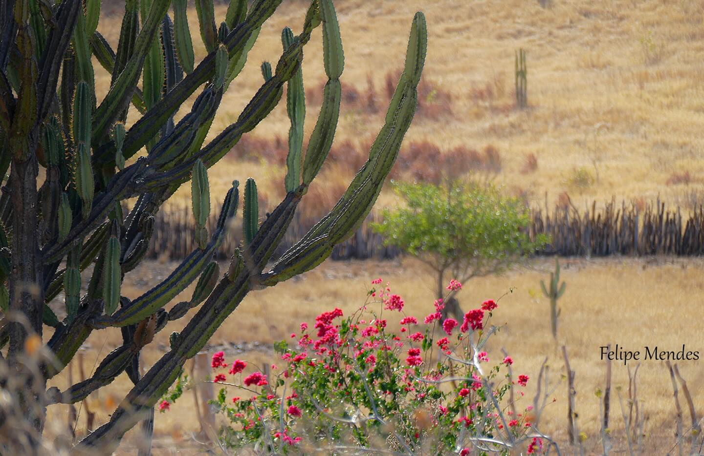 As cores da Caatinga no Nordeste do Brasil variam entre o verde intenso durante a estação chuvosa, tons terrosos, laranjas e marrons das folhas e troncos secos na estação seca, além de toques de amarelo, vermelho e rosado em flores e frutos específicos, e o característico branco dos troncos das árvores que ficam expostos no período de estiagem, um reflexo da estratégia de sobrevivência do bioma.