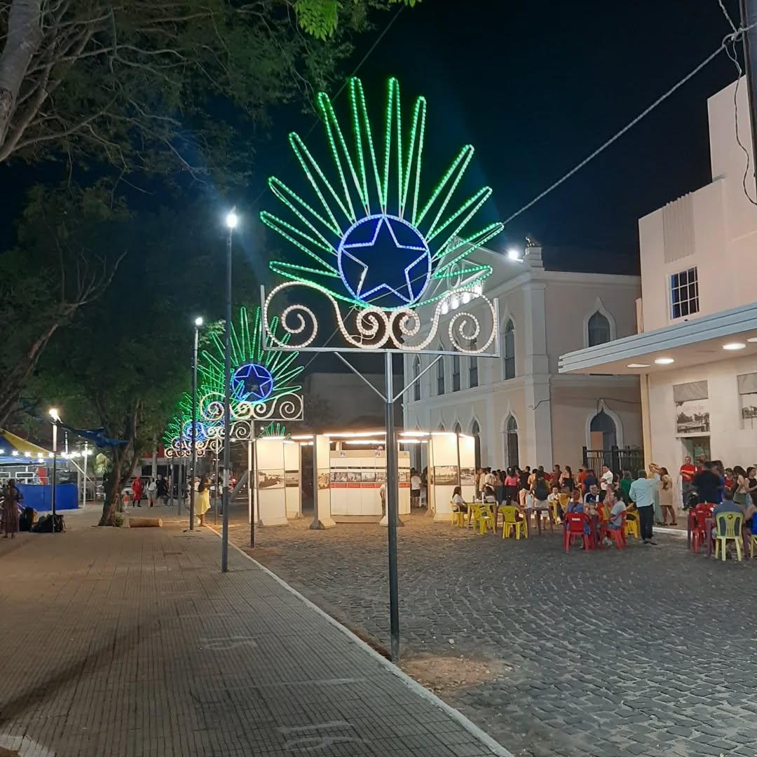 A decoração natalina, na noite, realçada pelas luzes brilhantes e coloridas dão um clima de Festas Natalinas e de fim de ano no centro antigo de Teresina-PI.